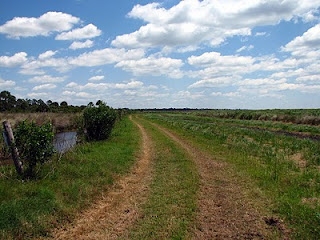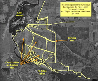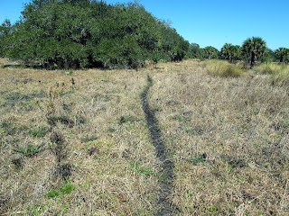 Moccasin Island Tract is a wonderful place hike and explore. It is very close to Melbourne and other surrounding cities. Over the last couple of years I have been to just about every section open to the public. It is amazing where you can go if you have a general idea of the area and a good handheld GPS. I always have my GPS handy so I know where I am and where my car is parked. First you must get to the parking area, just go West on Wickham Road until the pavement ends, them follow the dirt road (right side - N28 13.813 W080 45.356) West for another few miles until you come to the above sign, continue on a short distance to the parking area (N28 13.796 W80 48.679). Make sure you observe the gate closing time (it closes 7 pm sharp), if you are not out at closing time you will be left in there! After parking the car and getting ready you will now have to decide where you want to go - South to St Johns River, a beautiful Oak Hammock. You can also continue out to the Persimmon Campsite (may have historical value, but not sure of it) and then loop into the conservation area (no hunting in this area). You could go North to the Lake Winder observation area or detour to the namesake of the area, Moccasin Island. You can wind your way West along the canal next to the parking lot - use the North side to get to the Moccasin Island Area or use the South Side to take you into the conservation area. No matter where you go you will have two options, use the roads and trails or venture off into some pretty interesting areas to do some exploring. Always be aware when exploring that at different times of the year, different areas take on different personalities. If it is wet season, there is water and muck in many, many areas. If it is dry season, you will have much more access, but the grass can be so dense that you just can not get into it. The most access I've had is when it is very dry and there has been a recent burn in the area. During one of those perfect conditions I was able to walk through the conservation area, out to Persimmon Mound, then down along the St Johns River up to Lake Winder and then back to the parking lot along the canal which runs next to the parking area, That trip was over 11 miles, but it was very, very pretty. Always be aware that alligators can be in any body of water (just because you don't see them doesn't mean they are not there) and snakes which can bite you (I have come across a couple of water moccasins during all my travels). Look at "My Hikes" in the "links" section to see some of my suggested hikes. Those are just the some of the hikes I have done. If you would like some more information, send me an email with a question. As of 2/2011 I have hiked over 312 miles throughout the area, visiting it 34 times. You can see my average hike is around 9.17 miles. Some hikes with friends, others totally alone (cellphone coverage of the whole area makes me feel that much more comfortable). I have looked for and placed GEOCaches throughout the area, as well as looking for survey benchmarks. I have never encountered anything that I felt put me in danger, in all cases things avoided me! I prefer the south section below the parking area, actually the conservation area to the west of the barbwired cow pastures. The cow pastures on the west side of the road actually belong to the SJRWMD and are leased to the Duda cattle ranch. I met the SJRWMD land manager one day during my travels and asked him about crossing the pastures. He said as far as he was concerned I could do that, just respect the gates and cows. It is about .8 miles over to the conservation area which you can explore to your hearts content!
