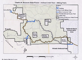 The local FTA chapter, with help from the SCA and other area chapter members, have constructed a beautiful section of the Florida National Scenic Trail System (FNST) which passes through the Joshua Creek Track. Access points are available from the Seminole Ranch/Orlando Wetlands and Chuluota Wilderness Area. There is an access point at the Phillips Road parking area, that is a short blue blazed connector trail. All trails are very well maintained and blazed. The FTA group and the SCA constructed bridges over major creek crossings and some low water areas to make the trail a little friendlier. I know you will encounter some wet areas during the wet season or after heavy rains, so be aware of that. If you should encounter major water down at the entrance at the Seminole Ranch Conservation area, there is a white blazed trail you can follow which will takes a dryer route, eventually connecting up with the FNST orange trail. They also will be constructing a white blazed loop trail that breaks off and reconnects to the orange blazed trail forming a loop in the Joshua Creek Tract. This will start down at the Orlando Wetlands or from the orange trail up near Chuluota Wilderness Area (blazed blue up there). I suggest you do your homework before attempting these trails, determine where you want to enter and exit them as the distances can add up. The total length of the trail between Seminole Ranch Conservation Area and Chuluota Wilderness Area is about 8 miles. You also have to hike quite a distance into either of those areas to get to the Joshua Trail. The day we hiked it we used two cars - it would have been a 20 mile hike if we had entered at the Seminole Ranch Conservation Area parking area on Wheeler Road, hiked up and over to the Chuluota Wilderness Area and back. By parking a second car at the Phillips Road Parking area the hike was 11 miles. A certain amount of the marked roads are crossed, so you can exit at different places. Your GPS might be your best friend out there. Remember, the blazed trails are for foot traffic only; no bikes or horses! These trails are a wonderful way to see the area; the creators/workers did a magnificent job!