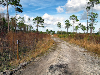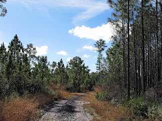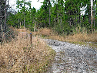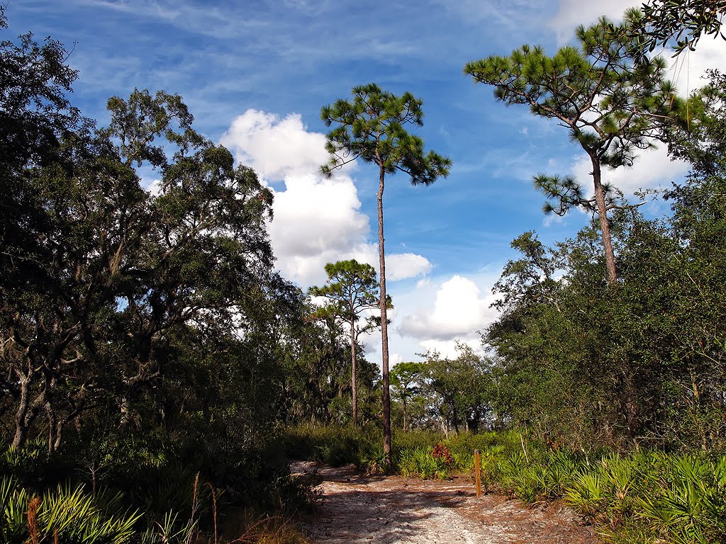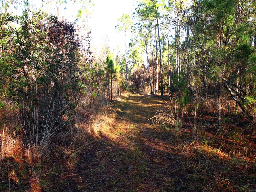 I did find a few areas and items that I felt were part of the old homestead which I am sure existed here once upon a time. That section consisted of cleared areas in the oaks, as well as some cinderblocks and wooden relics. As it seems with all Florida historical items, many things have gotten bulldozed under or burned out. I always feel someday this will be regretted by the powers to be when they want to know more about the county’s history. I did spot a few pine trees in a couple of areas which were used a long time ago to harvest sap with which to make turpentine. Just look for pine trees with major cuts in their sides. Usually if you look closer you will find a piece of metal in the cut used for the pots etc. If you do decide to try and venture West you will just hit wetlands. The tall pines along the trail are quite impressive.