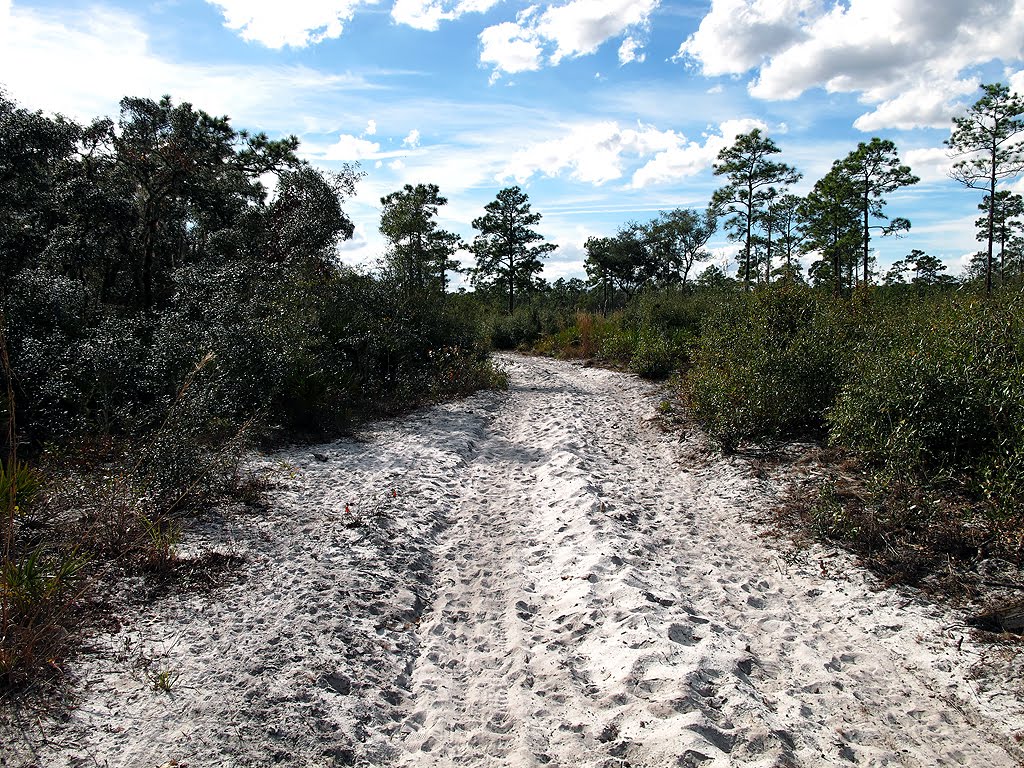 The blue trailhead is at the end of Lace Bark Pine Drive. There is a nice parking area provided by the county. Here you will find an information station, providing you with information about the area. This is also the entrance for the equestrian people. The complete trail is a loop only about 1.83 miles in length. The trail is actually just an old farm road. Some parts are packed down providing comfortable walking, while other parts are comprised of “sugar” sand, which can be cumbersome to walk in. The trail is almost completely in the sun, so take that into consideration. You can find some shady spots off the trail, which will provide some relief. The county has provided a picnic table on one spot of the trail and a metal bench on another part of the trail. I used these for two of my many breaks on the sunny day I visited the preserve. Between the sun from above and the sun bouncing off the white sand, I was a little warm. I suggest sunscreen and plenty of liquids on this short hike on a sunny day. The road is bordered on the outter side by oaks, scrub pines and wetlands. On the inner side there is a large area of palmettos. I did venture off the main loop road onto another old farm road to get a feel of the rest of the preserve. You can only go so far East or South as you will run into barbwire which marks the border of the preserve.